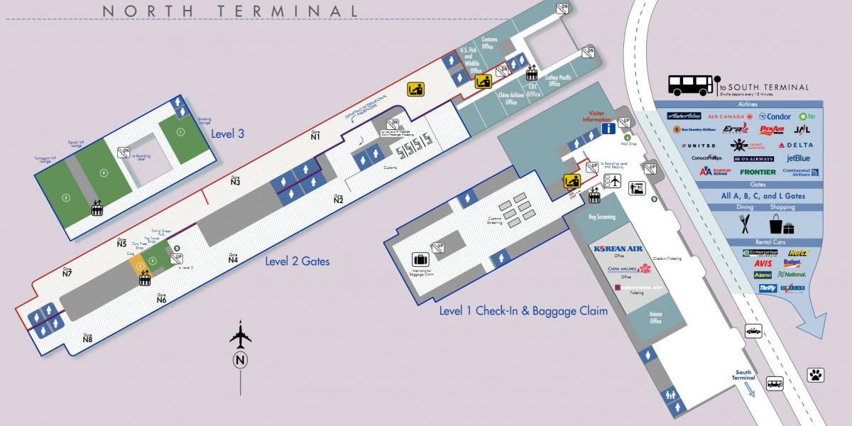 Аэропорт обслуживает рейсы авиакомпаний Air Canada (Ванкувер), American Airlines (Даллас), Alaska Airlines (Чикаго, Гонолулу, Лос-Анджелес), China Airlines, Condor, Delta (Атланта), US Airways, Japan Airlines и некоторых других, а так же рейсы между городами штата (Аниак, Фэрбенкс, Эммонак, Джуно).