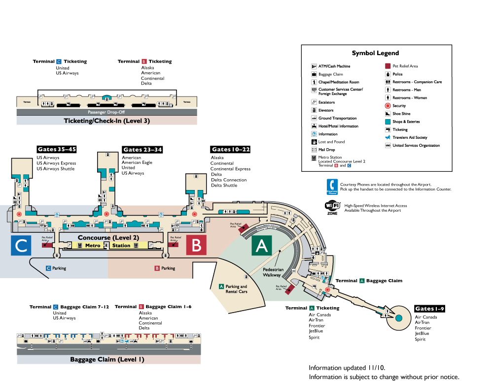 Сегодня Ronald Reagan Washington National Airport оборудован тремя терминалами, в каждом из которых есть своя справочная. Между терминалами, стоянками и метро ходят бесплатные автобусы.