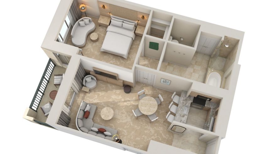 Роскошный номер, оформленный в современном стиле. В гостиной мягкая мебель и обеденная зона. Панорамные окна на океан. Две спальни. Ванные комнаты отделанные мрамором.