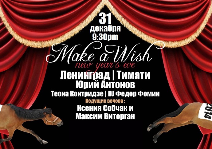 Новогодняя вечеринка MAKE A WISH WITH NEW YEAR'S EVE в ночном клубе ICE PALACE соберет сливки русскоязычного общества. В меню блюда, приготовленные по излюбленным и знакомым с детства рецептам. В программе: лидеры российских хит-парадов. Ведущие Новогоднего вечера - Ксения Собчак и Максим Витогран.