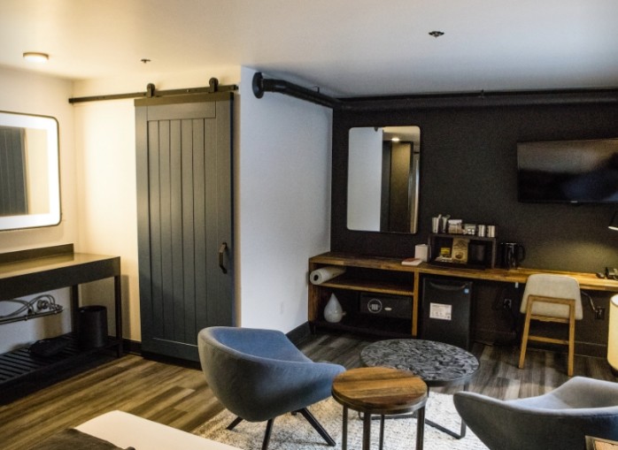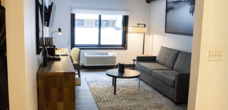 Интерьер в минималистическом стиле. В номере гостиная с небольшой зоной отдыха с кроватью king и маленькая спальня с двухярусной кроватью twin. Ванная комната с ванной и душем. Площадь: