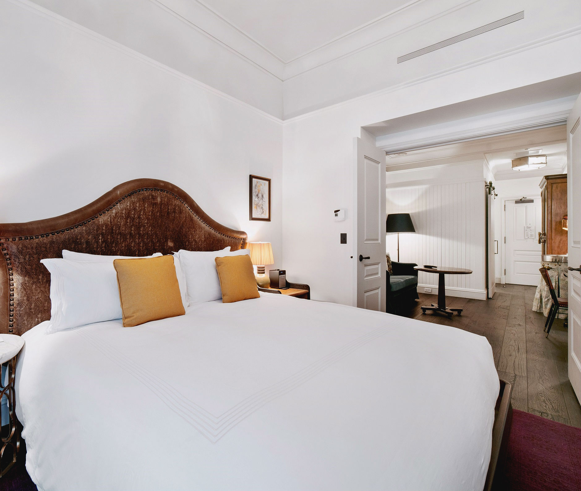 Номера с высокими потолками оформлены в бело-серых тонах с яркими акцентами. Сделанная на заказ мебель, кровать с кожаным изголовьем, состаренный дубовый паркет выглядят изысканно и элегантно, создавая комфортную и уютную атмосферу. В номере: спальня, гостиная с мягкой мебелью и рабочим столом. Ванная комната с душем отделана мрамором. Площадь: