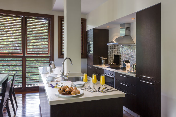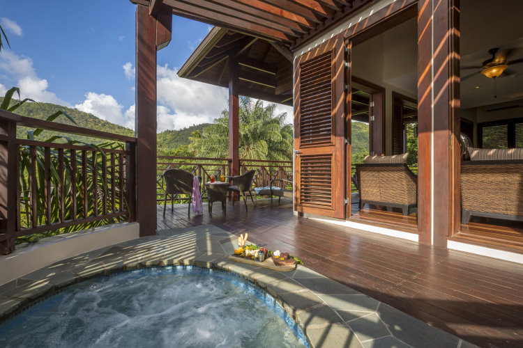 Номера на верхних этажах отеля с панорамным видом на тропические сады и залив. Высокие потолки и кровать с балдахином в спальне. Три спальни, отдельная гостиная, полностью оборудованная кухня, обеденная зона. Ванная комната с ванной и тропическим душем. Индивидуальный бассейн-джакузи на открытом воздухе. Площадь: