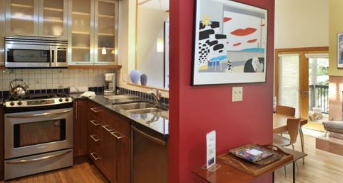 Кондо расположены в 3 минутах ходьбы от основного здания отеля и подъемника (круглогодичный джакузи, бассейн в летнее время года. Кондиционера нет). Современные апартаменты с индивидуальным оформлением. 2 спальни. Отдельная гостиная с зоной отдыха, полностью оборудованной кухней, обеденной зоной, камином в некоторых номерах. Две ванных комнаты. Площадь: