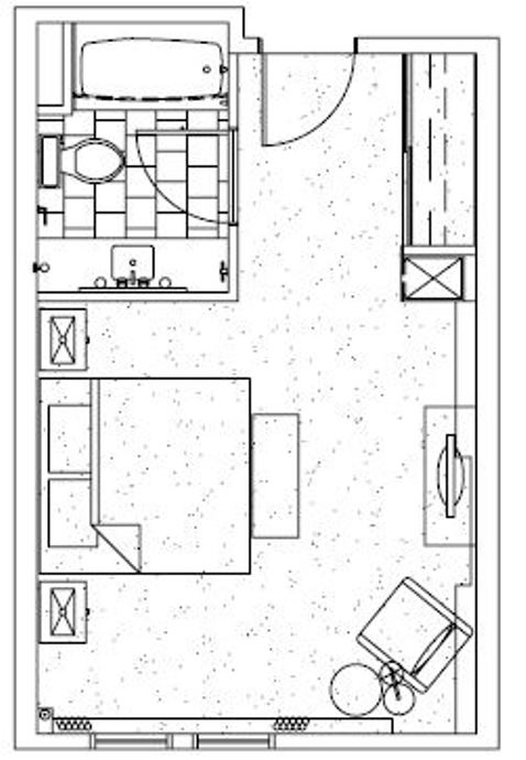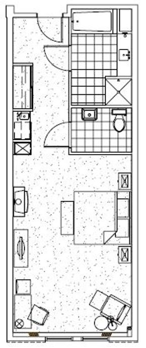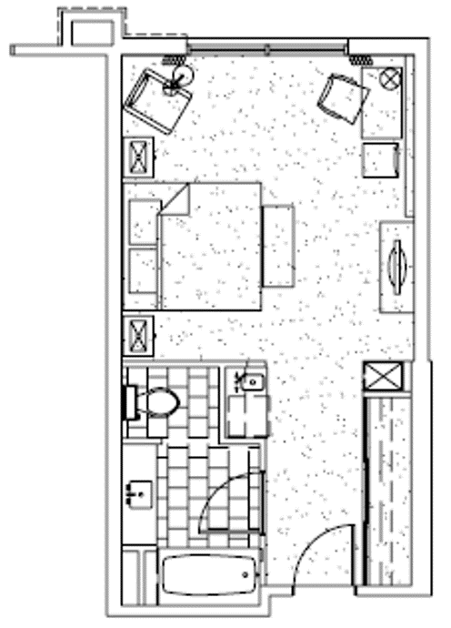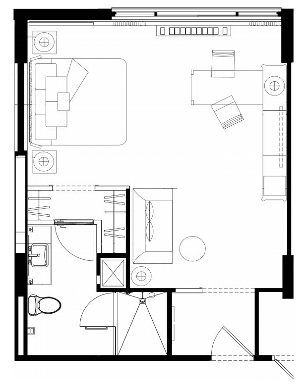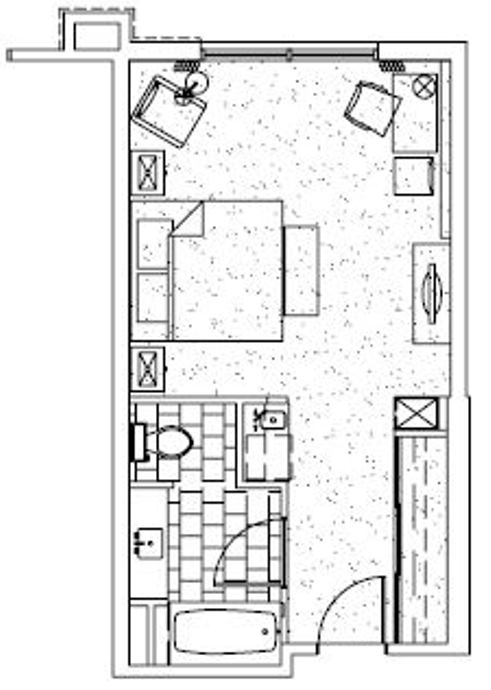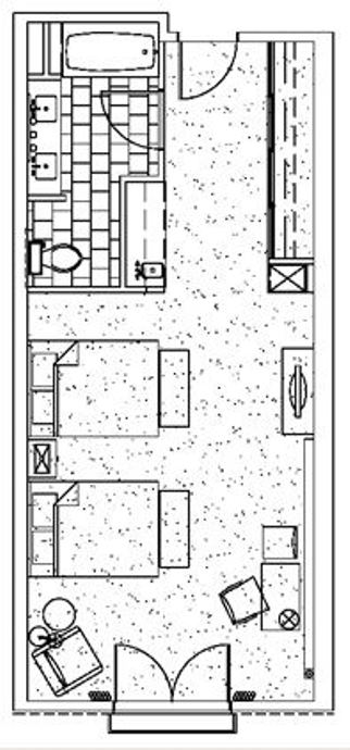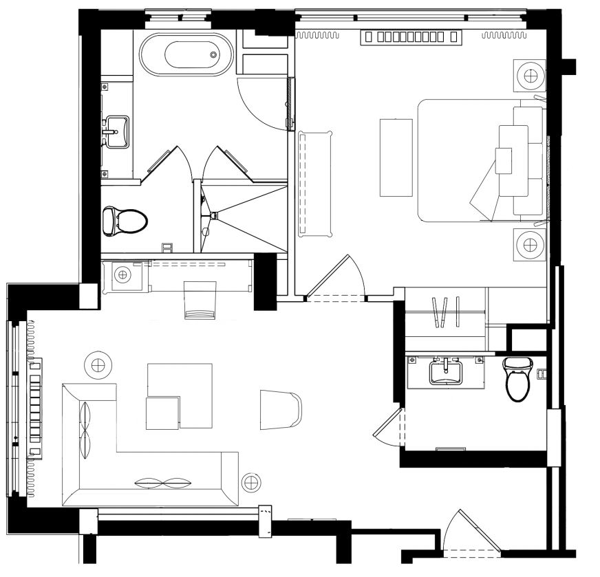 Современный просторный номер с зоной отдыха, письменным столом, кухонный уголок с холодильником, микроволновой печью, большие шкафы. Ванная комната с двумя раковинами и ванной. Площадь: