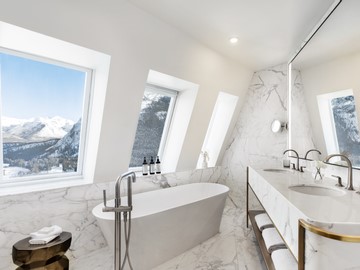 лучший номер в отеле расположен в башне замка. Доступ на частном лифте, зал для приема гостей, просторная зона для развлечений, бар, дополнительная туалетная комната и много окон. Обе спальни располагают кроватью king-size, креслом у окна и современной ванной комнатой. Великолепные панорамные виды. Площадь: