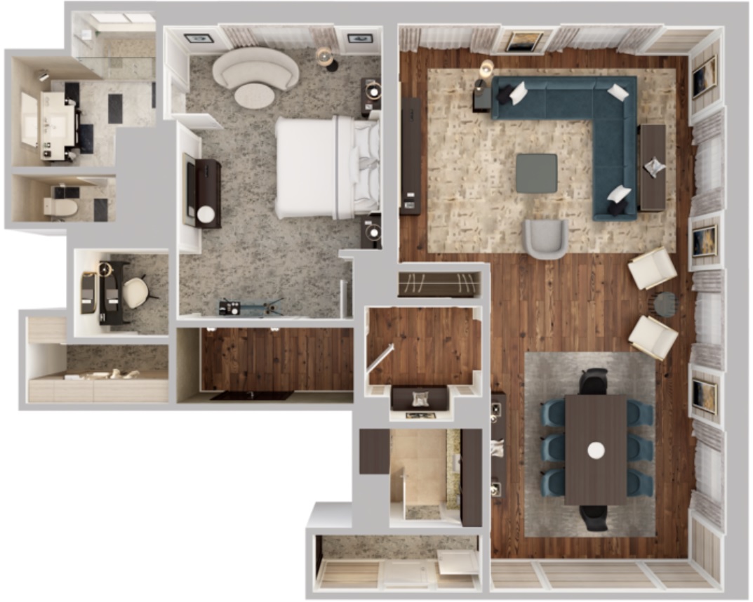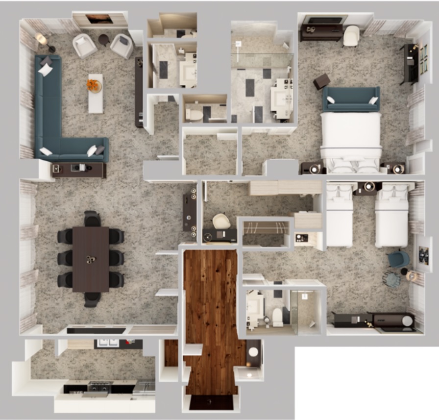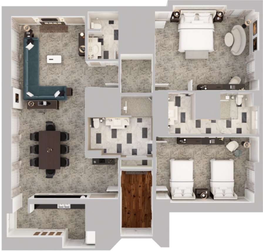 Двухэтажный номер. Нижний этаж: просторная гостиная с мягкой мебелью, рабочий стол. Столовая с обеденным столом на 8 персон, кухня, ванная комната. Верхний этаж: спальня, ванная комната. Номер может совмещаться еще с четырьмя спальнями. Площадь: