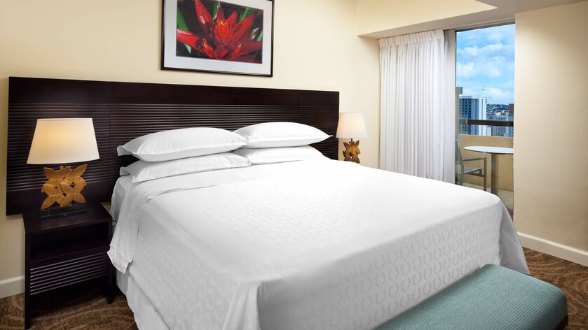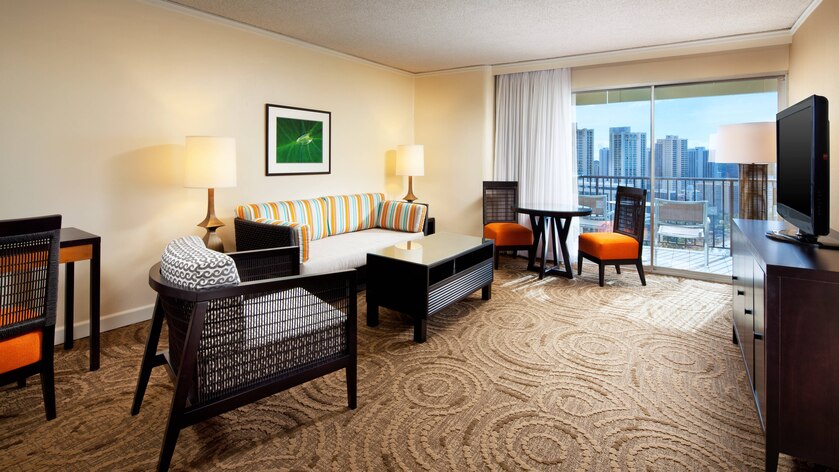 Элегантный номер в светлых тонах. В номере спальня, гостиная с мягкой мебелью, ванная комната с ванной, двумя раковинами, отдельным туалетом. Доступ в Leahi Club Lounge Площадь: