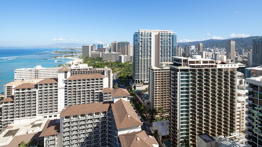 Вид на океан, вулкан Diamond Head и Waikiki Beach